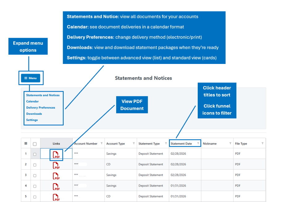 2025 Tax documents are now live in Online Banking. To view, navigate to the Statements and Documents tab (located under the More tab in the mobile app), your tax documents will display in the list below. You can filter out the specific type of statement you are looking for by clicking on the funnel icon next to the Statement Type header. Click on the red PDF icon to open the document.